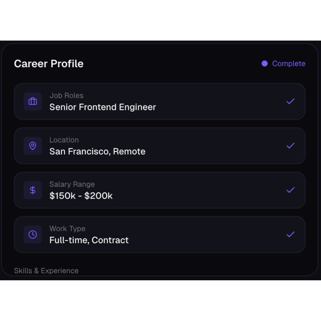 We understand your career goals by capturing your skills, experience, job roles, locations, salary expectations, and work preferences. all in one place.