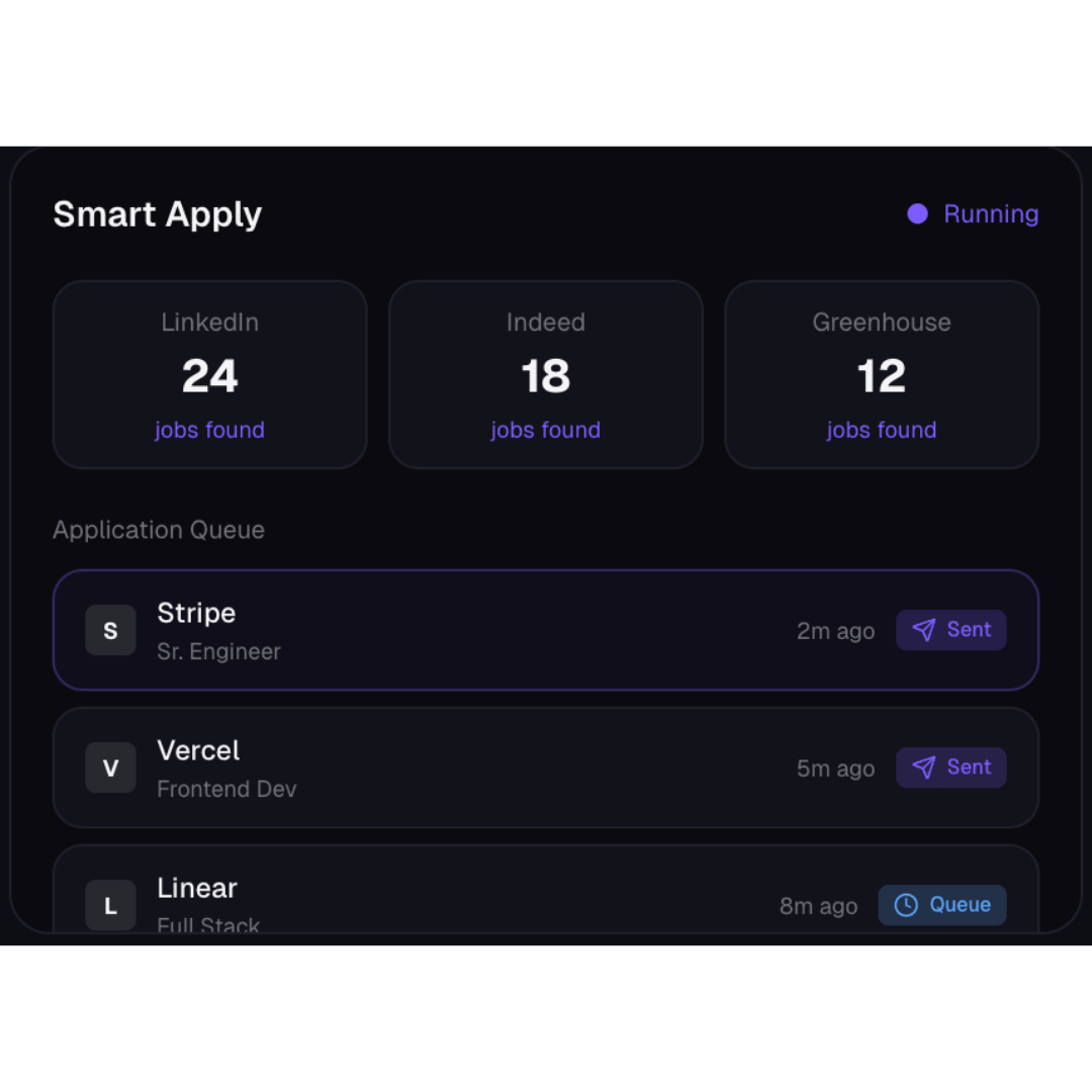 Set your preferences once, and let our AI apply to the right jobs, consistently and at scale.
